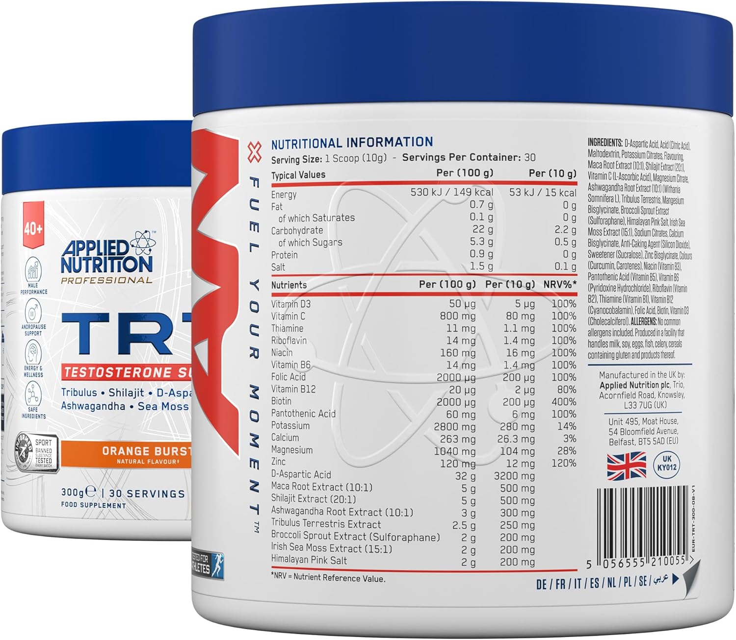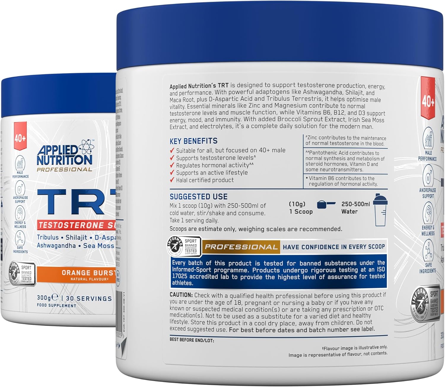 Applied Nutrition Agewell 40+ TRT, Orange Burst – 300 grams.TRT Testosterone Support je účinný denný produkt pre mužov nad 40 rokov, ktorý obsahuje zinok, horčík, D-aspartovú kyselinu, ashwagandhu a macu. Prirodzene podporuje hladinu testosterónu, energiu, náladu a výkon.